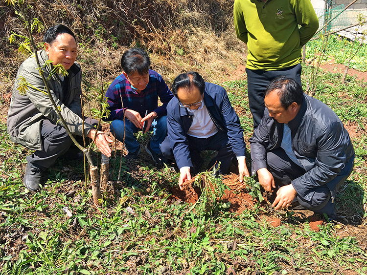 2020年3月26日,全國人大代表耿福能(左三)在涼山彝族自治州普格縣特爾果鄉督戰復工復產。圖為耿福能在查看川續斷種苗。